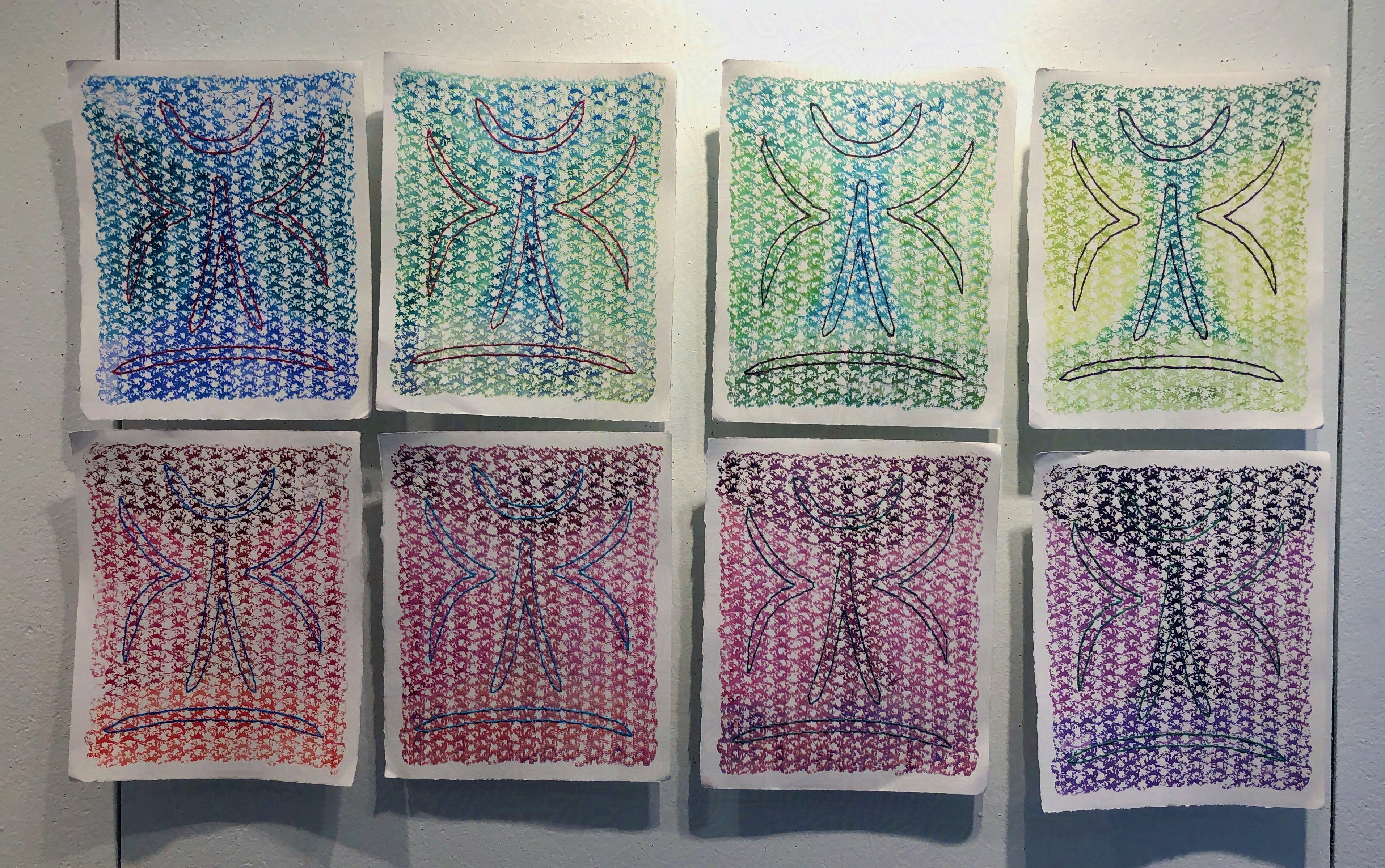 This is a watercolor monotype with embroidered symbols. The monotype itself is in the shape of a crocheted rectangle, and the stitches are very defined. This symbol means “hero” and it being repeated references how many small acts of goodness can add up to be heroic. This mirrors the idea of the title, with many small moments of peace adding up to a good life.